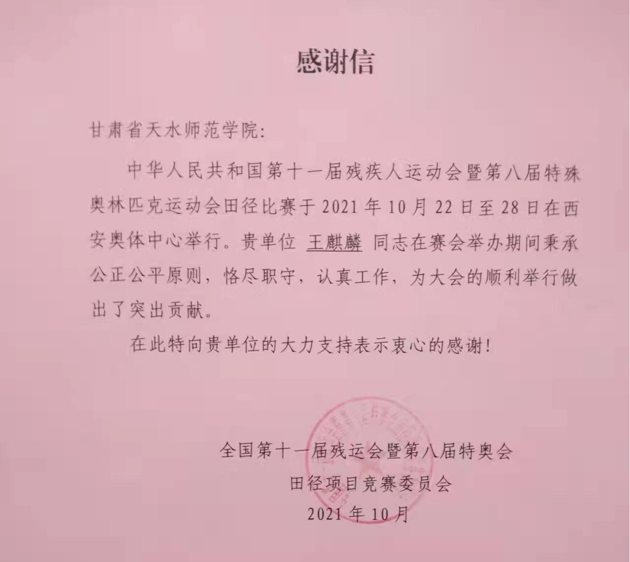 2021年10月22-28日,中华人民共和国第十一届残疾人运动会暨第八届特殊奥林匹克运动会田径比赛在西安奥体中心举行。新葡的京官网特奥田径国家级裁判王麒麟教授受中残联和国家体育总局选派为田径项目技术官员,并担任田赛裁判长。