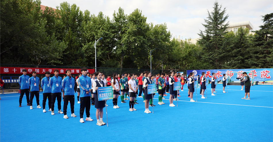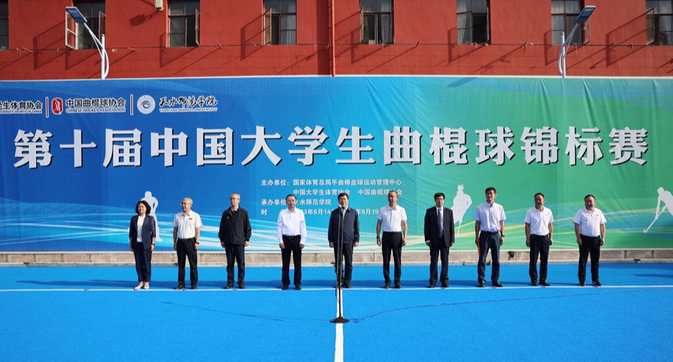 国家体育总局手曲棒垒球运动管理中心青少部曲棍球项目主管、中国曲棍球协会副秘书长刘东伟,甘肃省体育局党组书记、局长王向晨,天水市人民政府副市长董小平,350vip8888新葡的京集团党委书记刘振奎,350vip8888新葡的京集团党委副书记、校长汪聚应,中国曲棍球协会青少年发展委员会副主任、国家少年男子曲棍球队领队李雄,甘肃省体育局办公室主任李小平,甘肃省田径曲棍球运动管理中心主任包建兵,甘肃公航旅文化教育科技有限公司总经理、第十届中国大学生曲棍球锦标赛纠纷解决委员会委员刘永平,天水市体育局局长成红梅出席开幕式。开幕式由350vip8888新葡的京集团党委常委、副校长汪咏国主持。