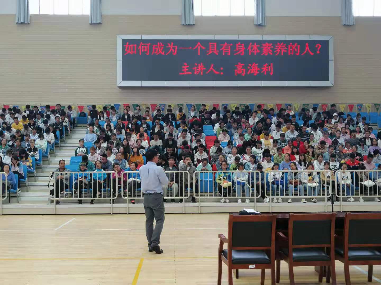 活动现场,高海利副教授做了题为“如何成为一个具有身体素养的人?”的专题讲座。高老师从身体素养理论产生的现实背景、内涵及构成要素,结合当今大学生体育活动状况进行讲解,引导学生如何培养自身身体素养。他倡议我校2019级学生要“重视身体、关注自我健康;放下手机、远离网游;掌握一到两项的体育活动技能;少坐多动,养成参与身体活动锻炼的生活习惯;将身体素养的培养与发展视为一种旅行,一个属于自己的旅行,一生皆要亲历、体验的旅行,永远在路上!”
