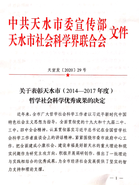 近日,经天水市委宣传部《关于表彰天水市(2014-2017年度)哲学社会科学优秀成果的决定》【2020】29号文件公布,新葡的京官网程晖、秦婕、王怀虎、段文义、陈玮等教师喜获优秀成果奖。