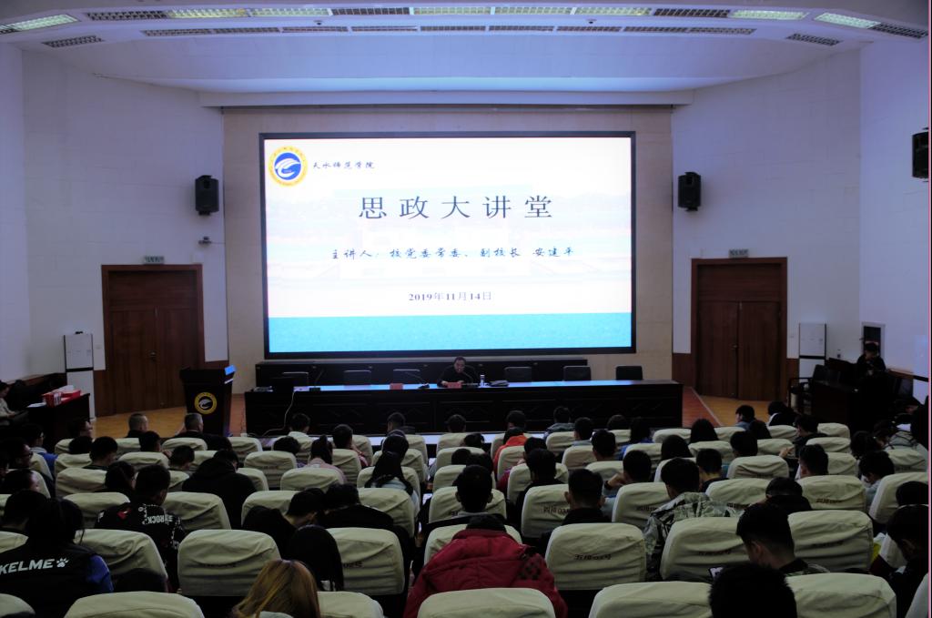 11月14日晚7点半,学校党委常委、副校长安建平在2号报告厅开设思政大讲堂,为350vip8888新葡的京集团师生宣讲党的十九届四中全会精神。会议由350vip8888新葡的京集团党总支副书记吴建全主持,体育学院辅导员以及学生共计300多人参加。