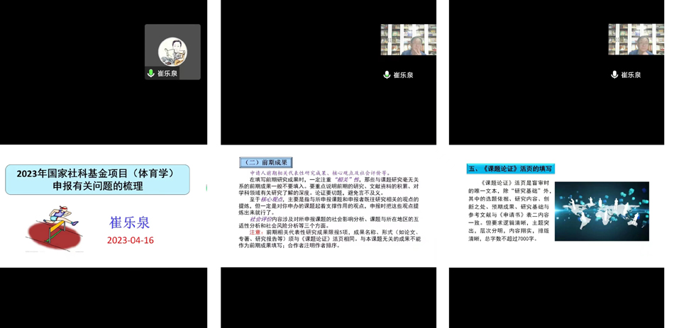 报告会上,崔乐泉对2023年国家社科基金项目申报相关问题进行了梳理,重点阐述了国家社科基金项目选题的注意事项及当前选题热点高频词汇,并对《2023年度课题指南》中“综合性选题”与分学科中“体育学”选题的关系进行解读。崔乐泉重点从“选题依据、研究内容、创新之处、预期成果、研究基础”等方面的具体论证以及文本撰写,对教师申报2023年国家社科基金项目逐一进行悉心指导。同时,指出教师申报书初稿存在的问题,提出修改建议,并与师生进行了学术交流。